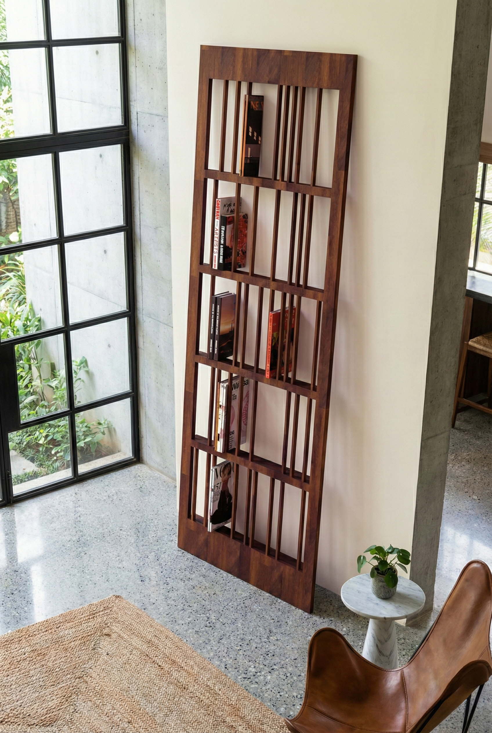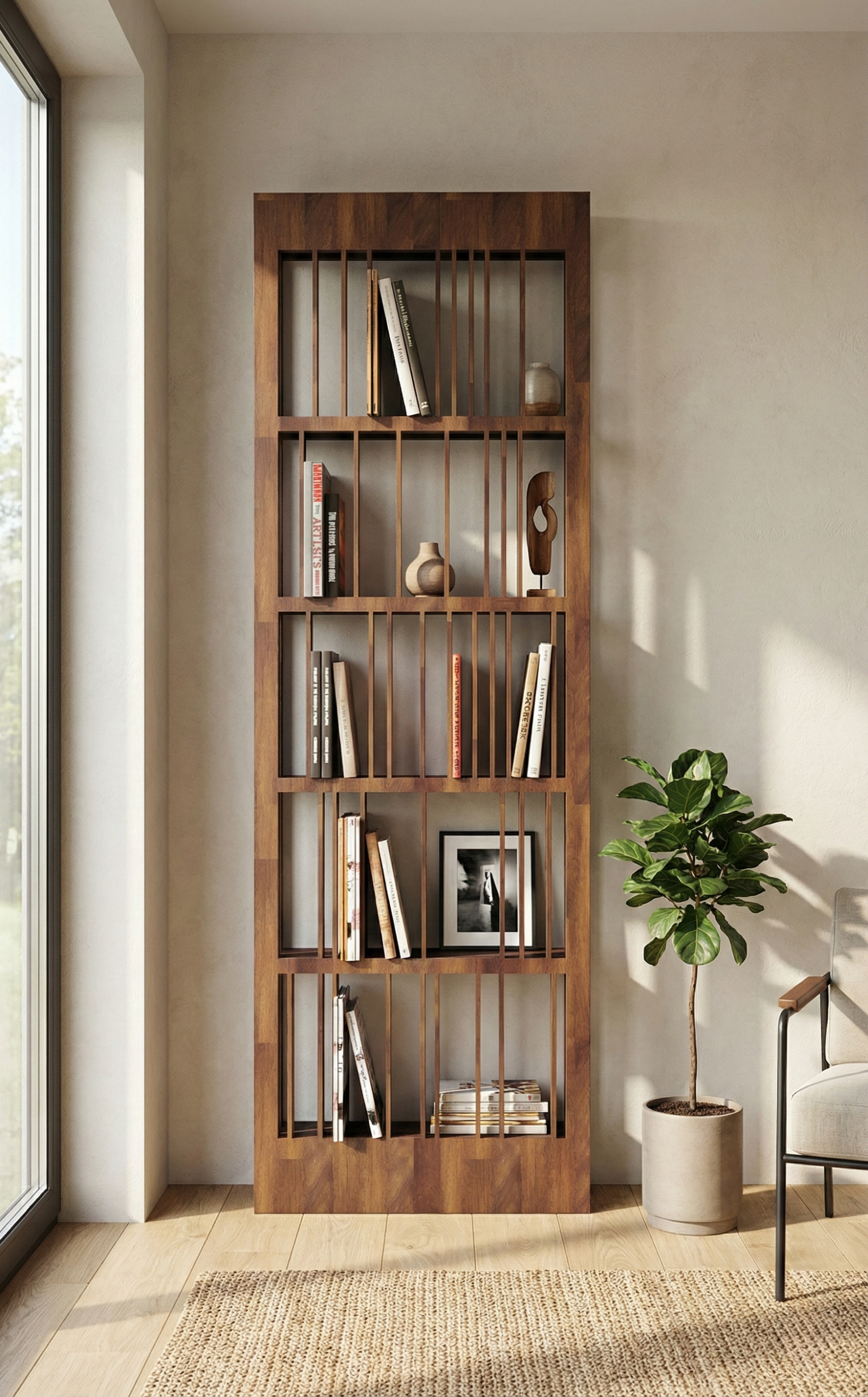 Dure, klasik depolama anlayışını bir kenara bırakıp, kitaplığı bir “duvar heykeli” olarak yeniden yorumluyor. Tasarımın özünü oluşturan dikey masif iroko çıtalar, tıpkı bir barkod veya müzik notası gibi belirli bir ritimle sıralanmıştır. Bu asimetrik dizilim, arkasına yerleştirdiğiniz kitapların kapaklarıyla birleştiğinde, her kullanımda değişen dinamik bir tablo ortaya çıkarır.