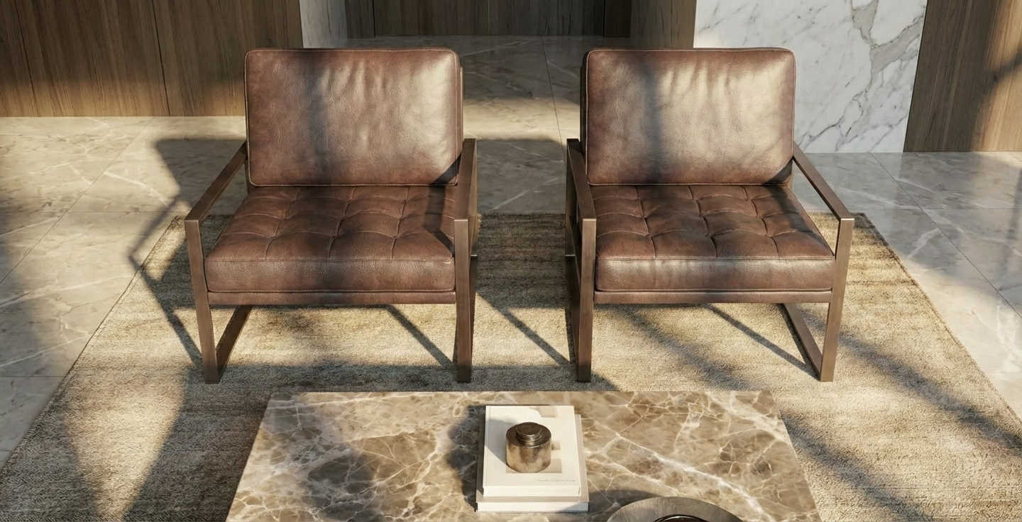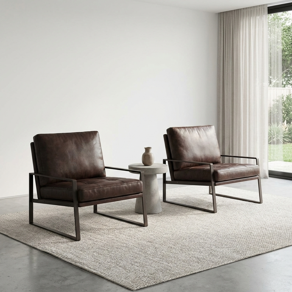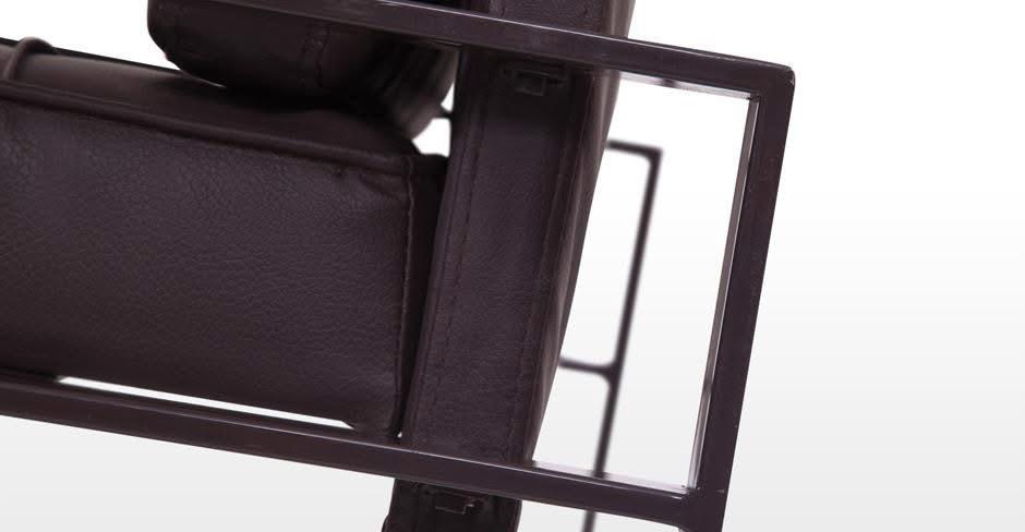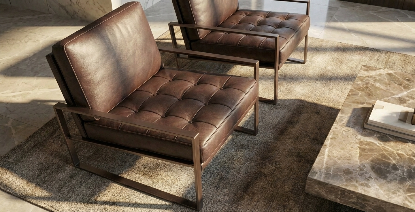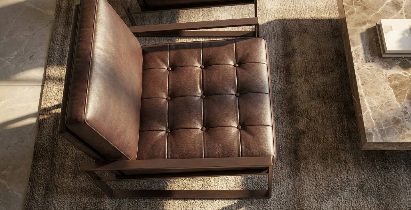 Tasarım ve İşçilik: Kusursuz kaynak işçiliğiyle birleştirilen kare profil metal iskelet, mimari bir iskele gibi sağlam ve nettir. Bu sert strüktürün içine yerleştirilen yumuşak dolgulu deri minderler, tasarıma sıcaklık ve konfor katar. Oturum minderindeki düğmeli kapitone (tufted) detaylar, ürüne klasik bir “Chesterfield” atıfı yaparken, sırt kısmındaki düz form modernizmi korur.